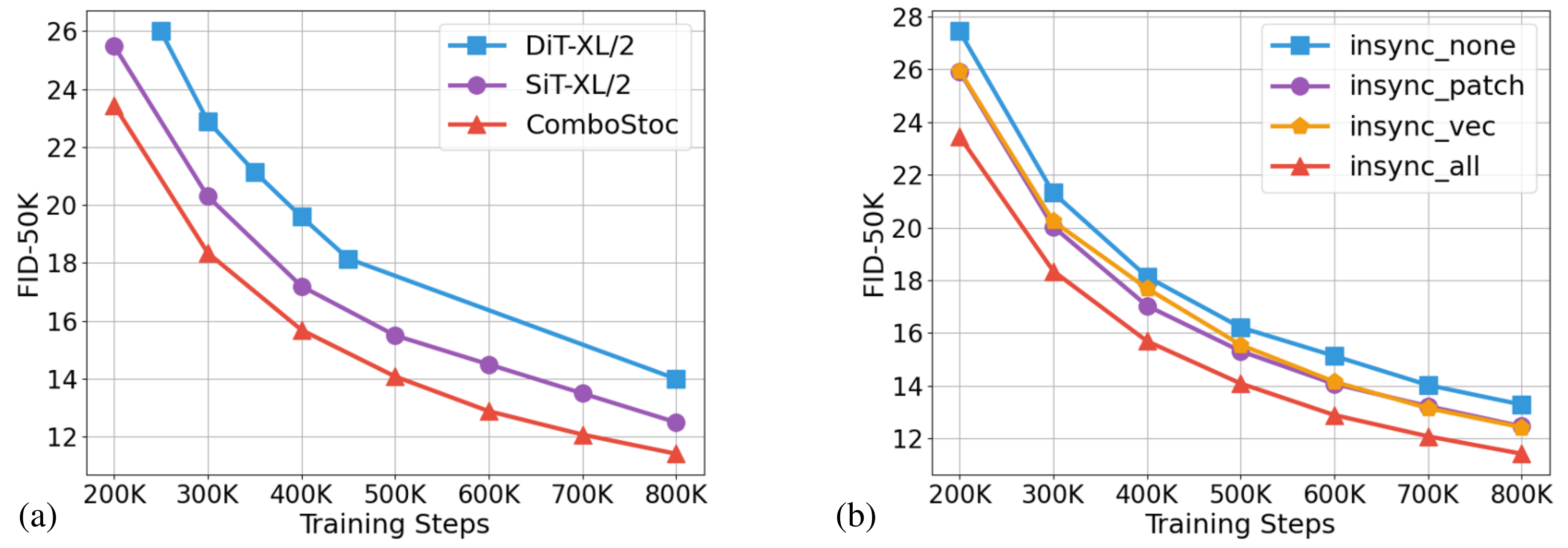 Comparison on image generation with respect to training steps. (a) plots the baseline