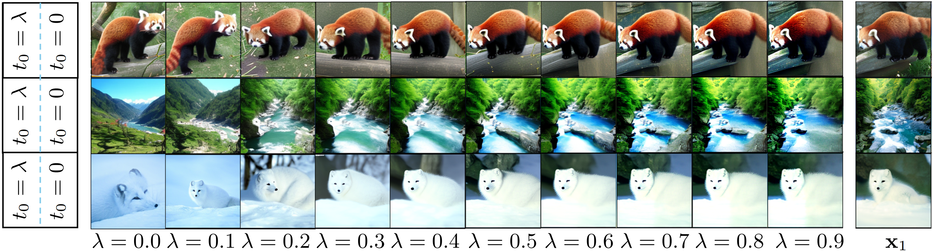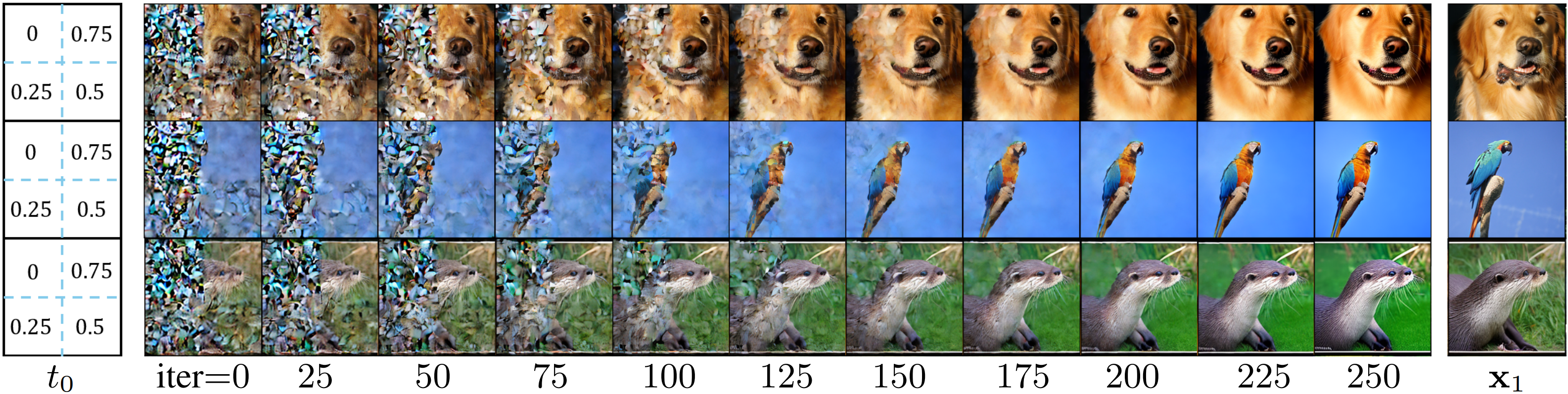 Image generation with spatially different preservation weights. As shown in the left column, the four quadrants use t0 = 0, 0.25, 0.5, 0.75, respectively. The sampling iterations converge to results that preserve the corresponding quadrants from the reference images (right) differently.