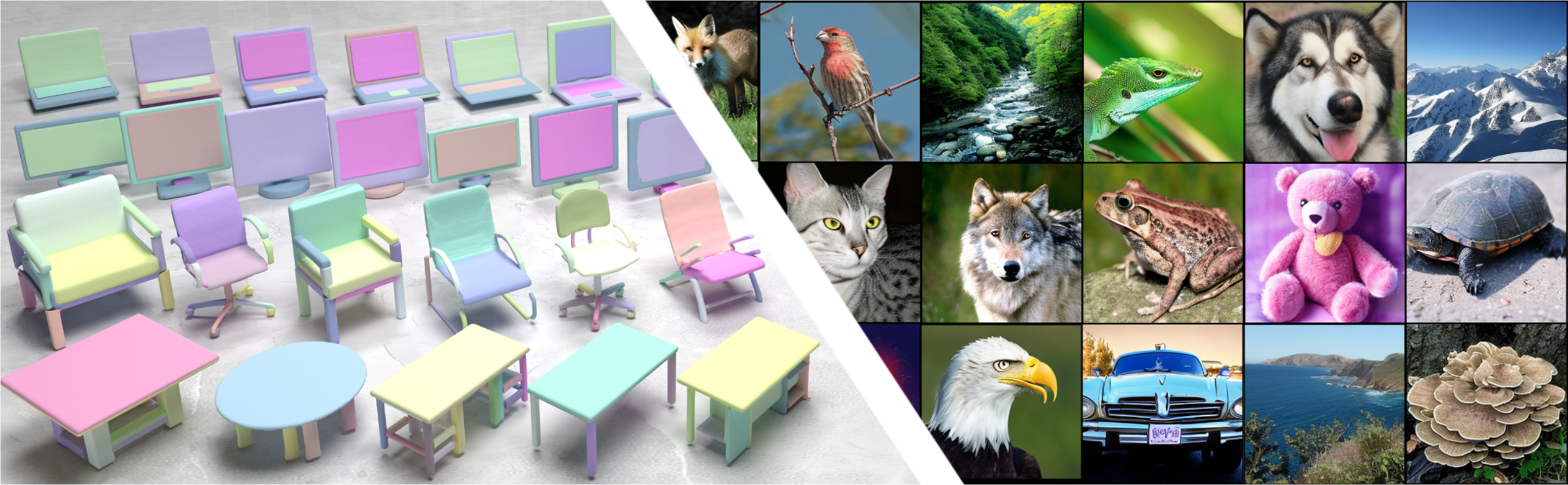 Image generation using different weights of preservation. Each reference image (right) is split into two vertical halves (left), and the left half is given the preservation weights while the right region starts from scratch.