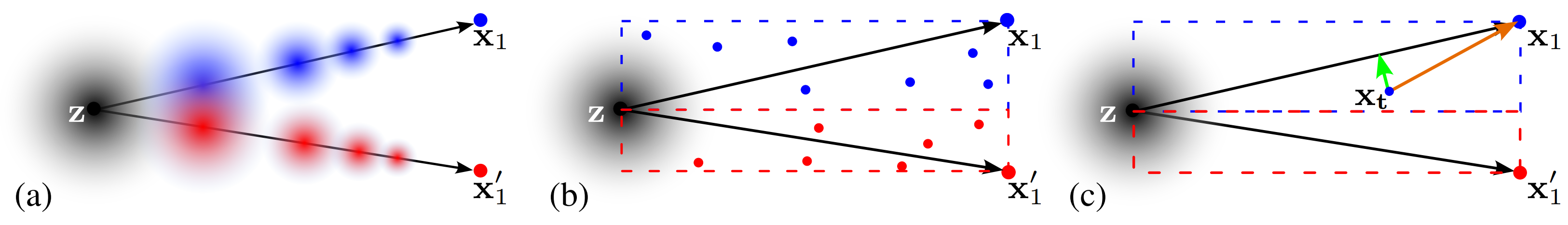 ComboStoc enables better coverage of the whole path space. Assuming two-dimensional data samples. (a) the standard linear one-sided interpolant model reduces its density as it approaches individual data samples; the low density regions are not well trained and once sampled would produce low-quality predictions. (b) using ComboStoc, for each pair of source and target sample points, a whole linear subspace spanned with their connection as the diagonal will be sufficiently sampled, so that there are fewer low-density regions not well trained. (c) when the network is trained to predict velocity x1 − z, on an off-diagonal sample point xt, a compensation drift (green vector) is needed to pull the trajectory back to diagonal.
