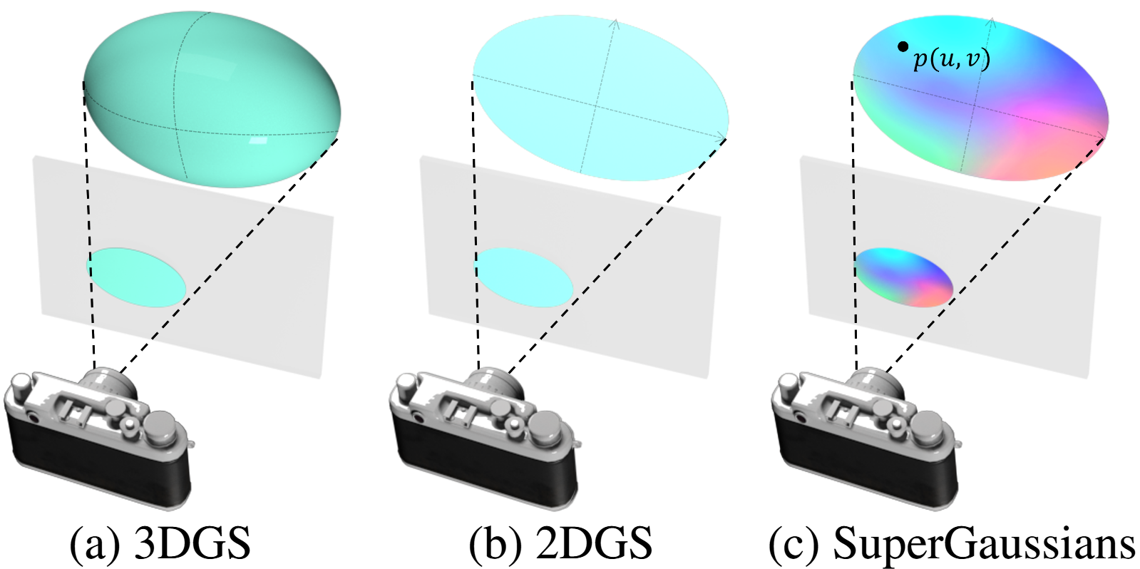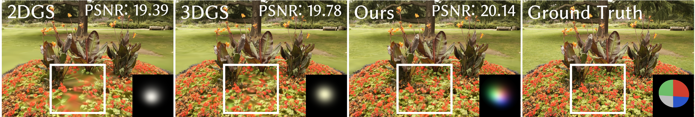 SVGS gives each Gaussian the ability to vary spatially. Compared with 2DGS and 3DGS, SVGS is more expressive and can better reconstruct details (as seen in the white area). Additionally, SVGS can express more color variations using only one Gaussian, instead of being limited to just one color (bottom right).