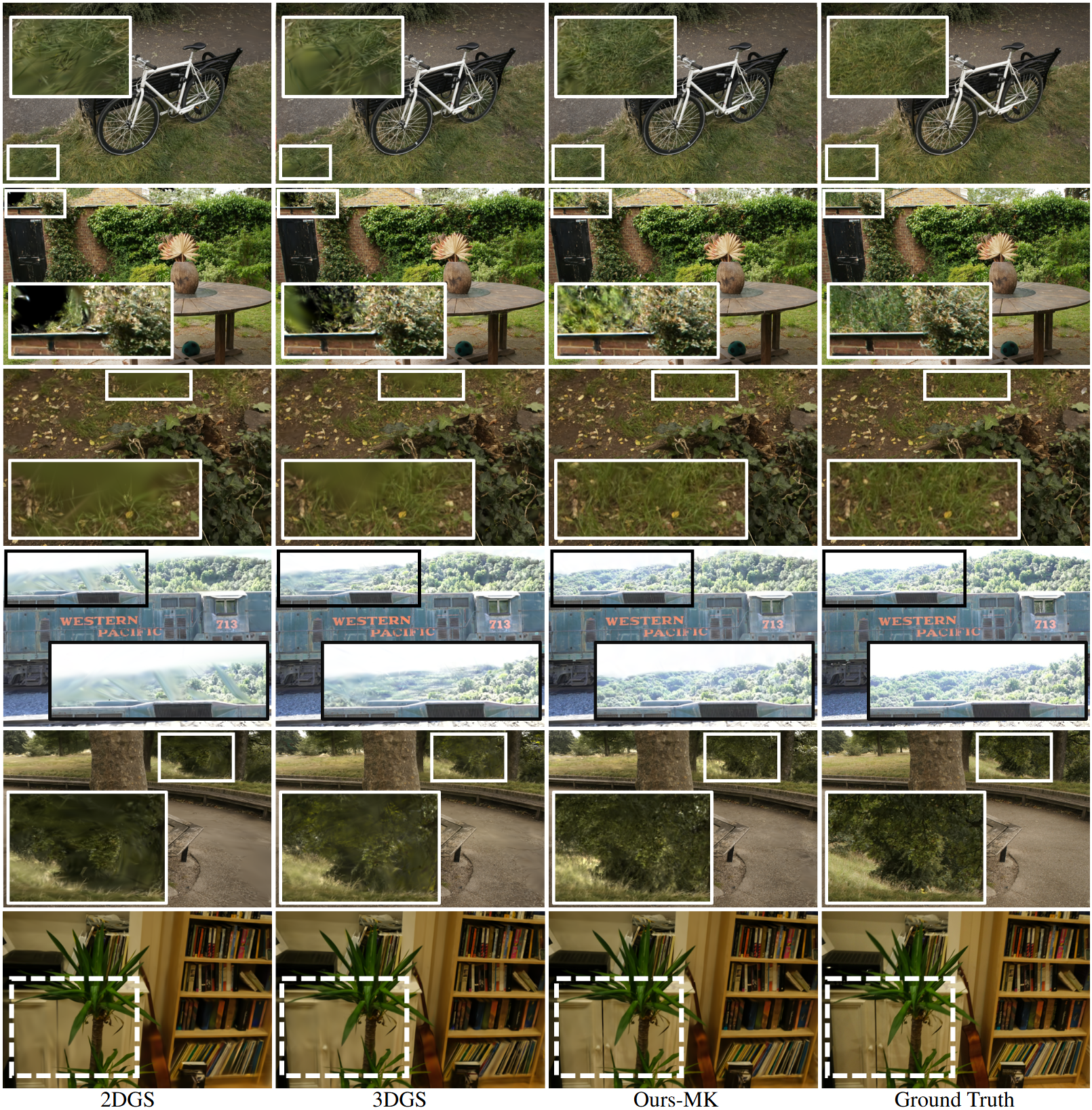 Visual comparison with 2DGS and 3DGS on both the Mip-NeRF360 dataset and the Tanks&Temples dataset shows that SVGS can reconstruct details better due to stronger expressiveness.