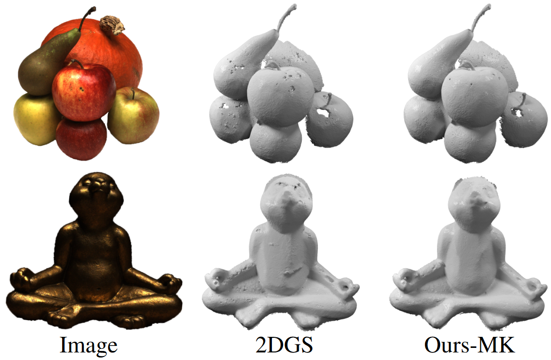 2DGS has demonstrated impressive capabilities in geometric reconstruction. Since SVGS is implemented based on 2DGS, it inherits these excellent geometric reconstruction capabili- ties, although this is not our primary objective. The results demonstrate that our geometric reconstruction capa- bilities are comparable to 2DGS when there is no limit on the number of Gaussians, while also ensuring the high- est PSNR, indicating the best image reconstruction quality. Furthermore, when a limited number of Gaussians is used, our powerful expressiveness becomes apparent, greatly out- performing 2DGS in both geometric reconstruction quality and image rendering quality.